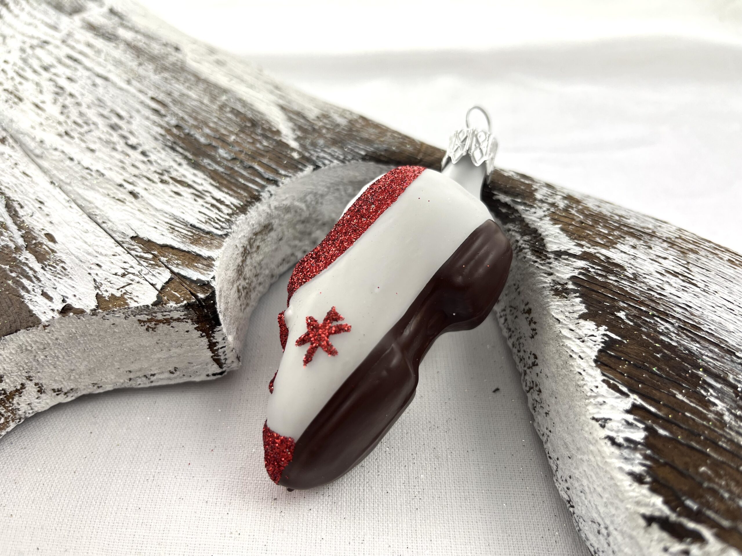 Sklenená ozdoba v podobe bielej črievičky s červeným zdobením .