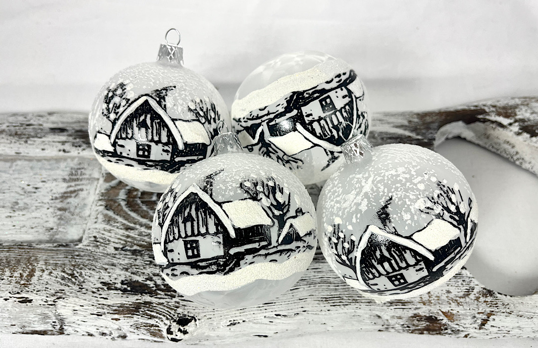 Frosted White Glass Baubles with Snowy Cabin Motif