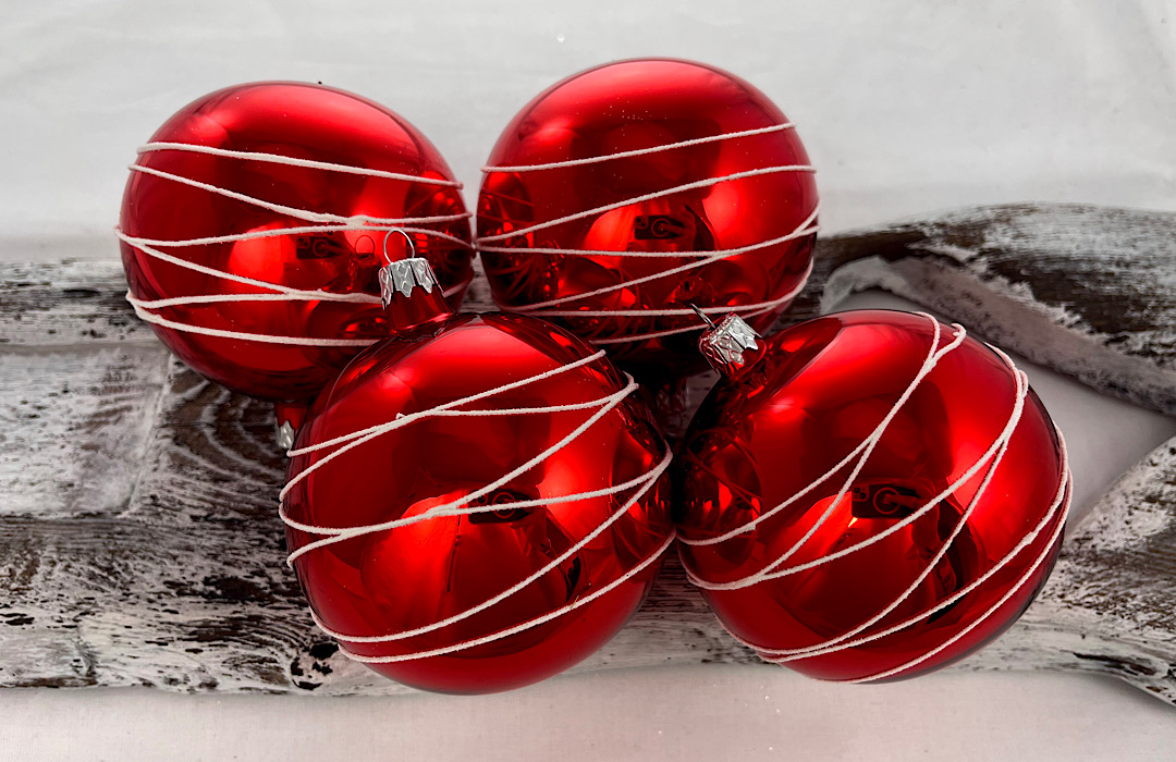 Make a bold statement on your tree with these striking red glass ornaments. Each bauble features a glossy, high-shine finish, elegantly entwined with a delicate white “chain” pattern. The dynamic, swirling lines create a modern twist on a classic holiday favorite, catching the light from every angle. These vibrant ornaments are perfect for adding energy and contemporary style to your traditional Christmas decor.