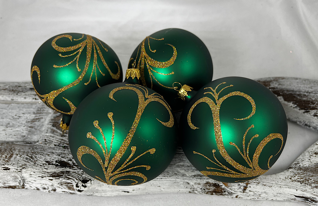 Embrace the classic spirit of Christmas with these exquisite glass ornaments. Finished in a rich, deep forest green matte, each bauble is hand-decorated with a sophisticated golden floral motif. The shimmering glitter detail creates a stunning contrast, making these ornaments a timeless addition to your festive tree.