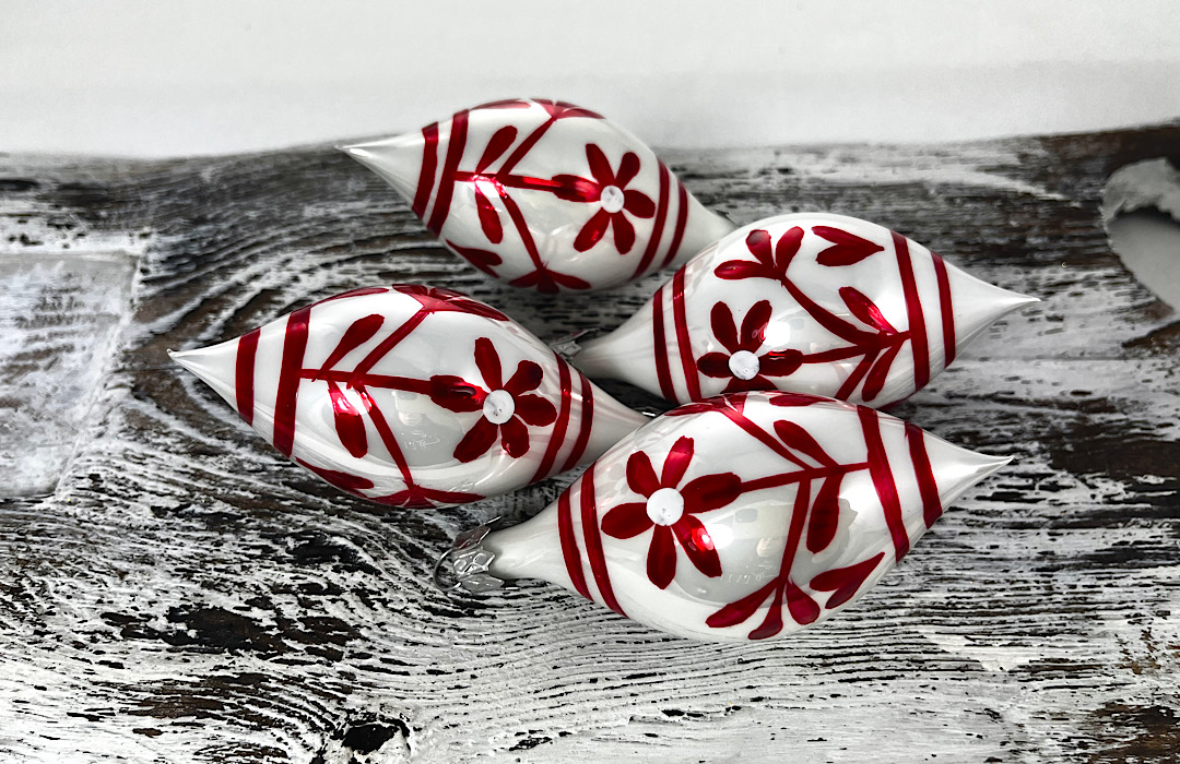 Celebrate the beauty of heritage with these stunning “porcelain effect” glass ornaments. Each pristine white olive is adorned with a vibrant red folk-inspired floral motif, reminiscent of traditional European embroidery. The elegant pattern features stylized blossoms and heart-shaped leaves, framed by delicate horizontal stripes. These handcrafted ornaments perfectly blend cultural tradition with modern holiday elegance, making them a meaningful and artistic addition to your Christmas tree.