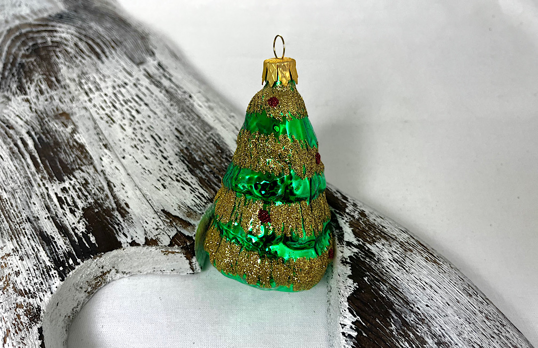 Celebrate the heart of the holidays with this charming glass Christmas tree ornament. Expertly mouth-blown into a traditional mold, this piece features a vibrant  green finish. Each layer of the tree is generously adorned with thick bands of golden glitter, mimicking sparkling festive garlands, and accented with tiny red berries. Its unique textured surface and rich sparkling details make it a standout piece that brings a classic, joyful spirit to your tree.
