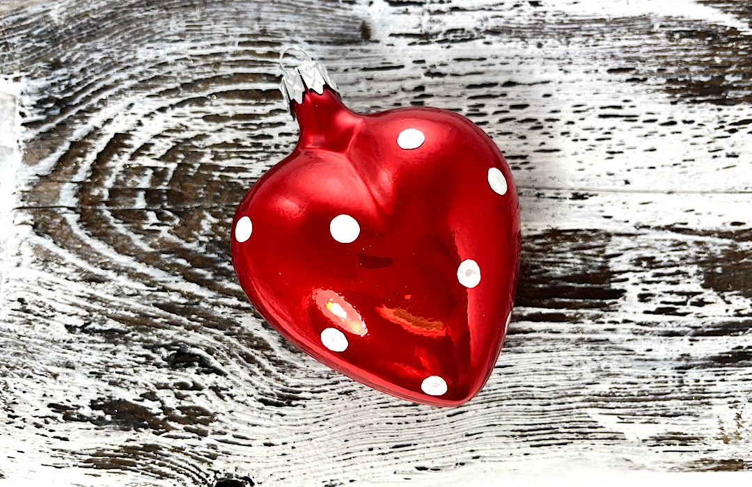 Add a romantic and timeless touch to your holiday tree with our large handcrafted glass heart. This stunning piece features a unique “porcelain effect” finish in a rich, vibrant red, giving it a solid and luxurious look. Hand-painted with charming white polka dots, this heart combines classic folk-art style with modern elegance. Each piece is mouth-blown by skilled artisans, making it a beautiful symbol of love and tradition for your Christmas home.