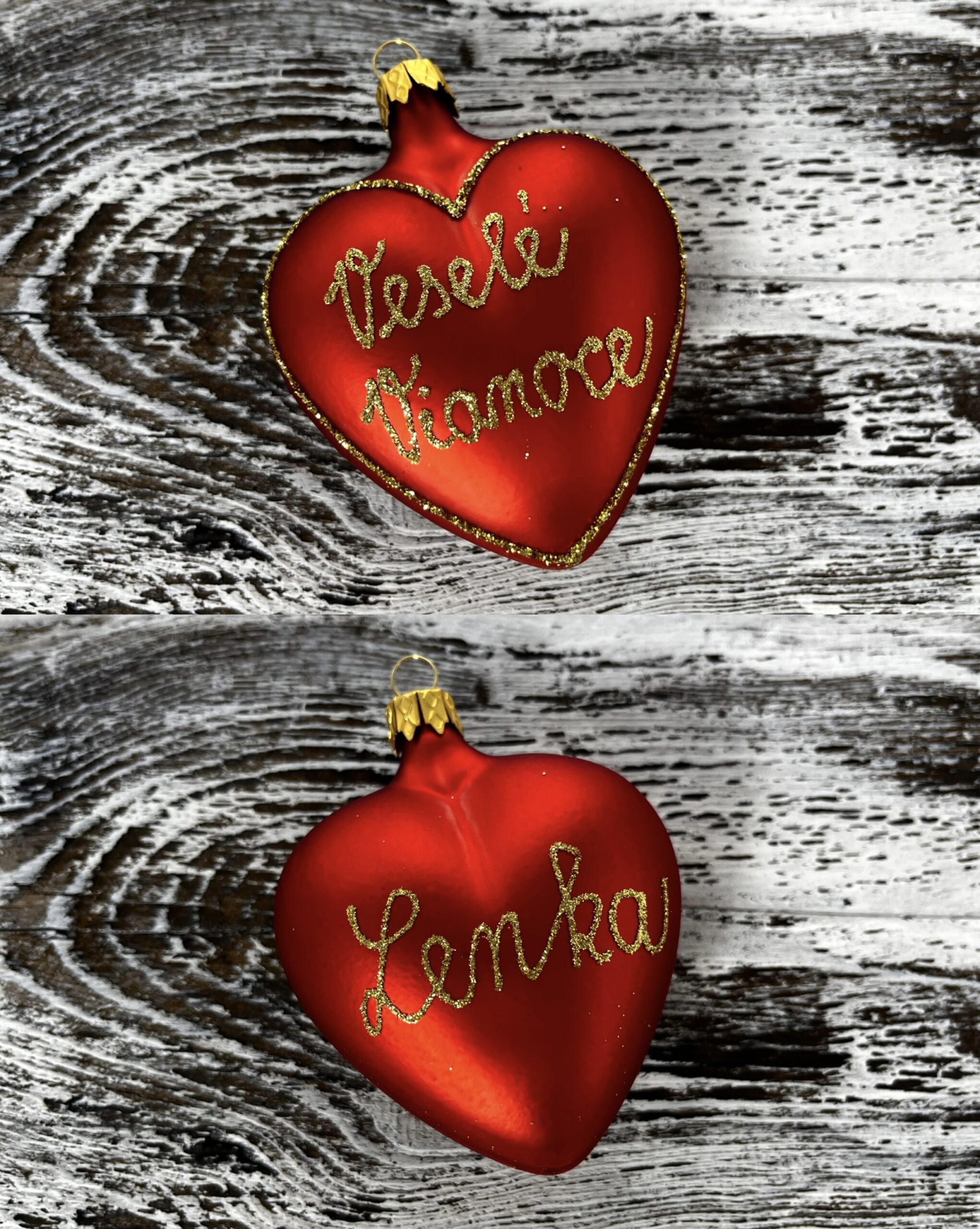 This elegant red glass heart features the traditional greeting “Veselé Vianoce” (meaning Merry Christmas) exclusively in the Slovak language. The text is beautifully written in gold. The back of the ornament offers a personalized touch where you can have a name or a date added (maximum 3 words).