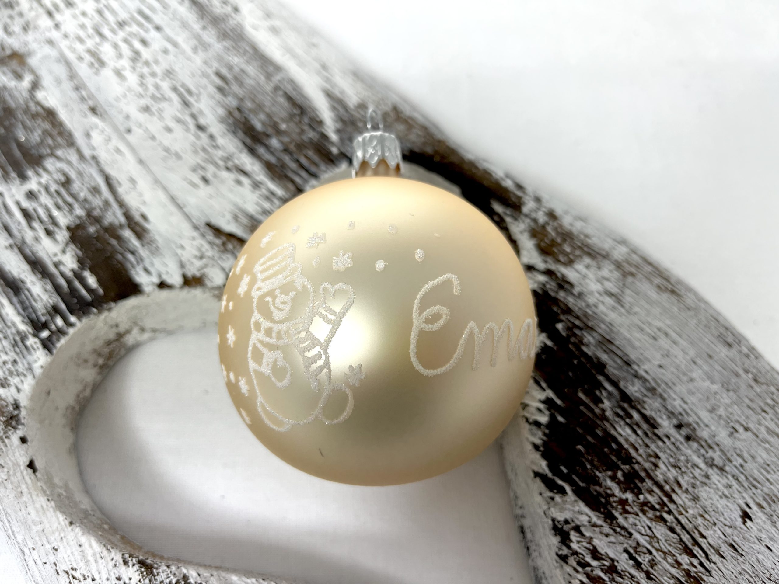 Celebrate the magic of Christmas with a truly unique keepsake. Our matte champagne glass bauble features a charming snowman surrounded by delicate snowflakes. Make it extra special by adding a name of your choice, beautifully handwritten by our artists. Each ornament comes safely nestled in its own individual box, making it a perfect present for loved ones.