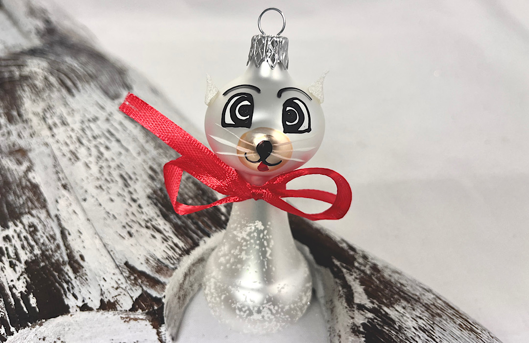 Sklenená figúrka v podobe mačičky . Ušká biele . Okolo krku uviazaná červená mašlička .