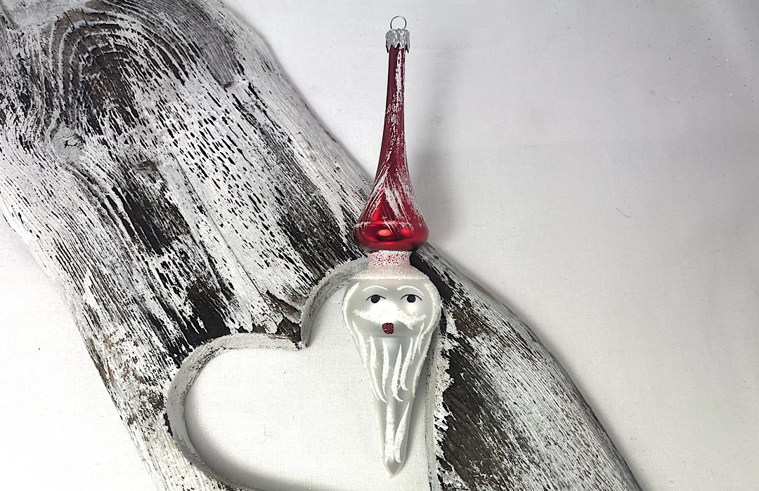Sklenená figúrka v podobe Mikuláša . Ide o vysokú figúrku pretiahnutej olivy s vežičkou.