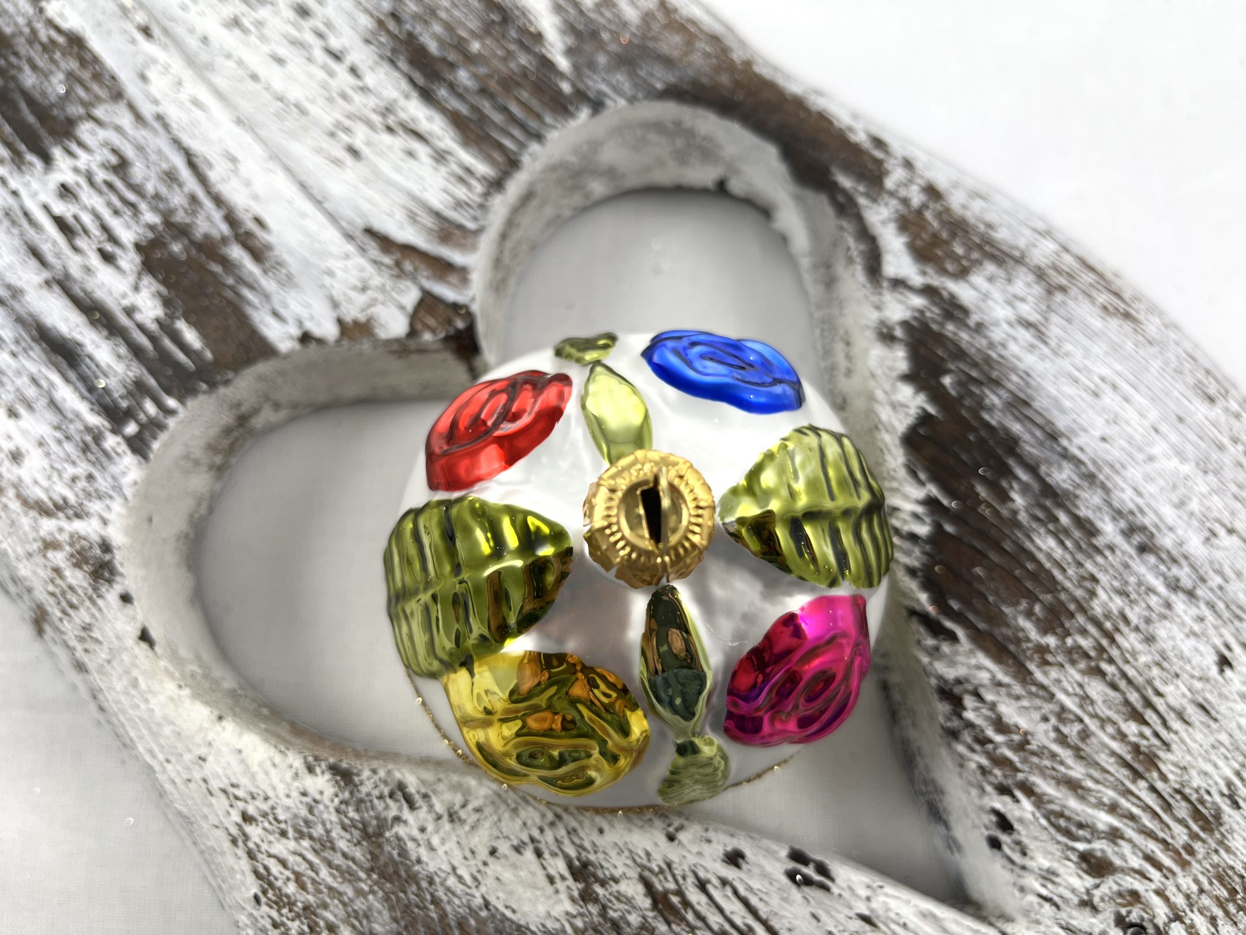 Sklenená vianočná ozdoba v retro štýle . Na košíku sa striedajú štyri ruže : červená, modrá , žltá a ružová.