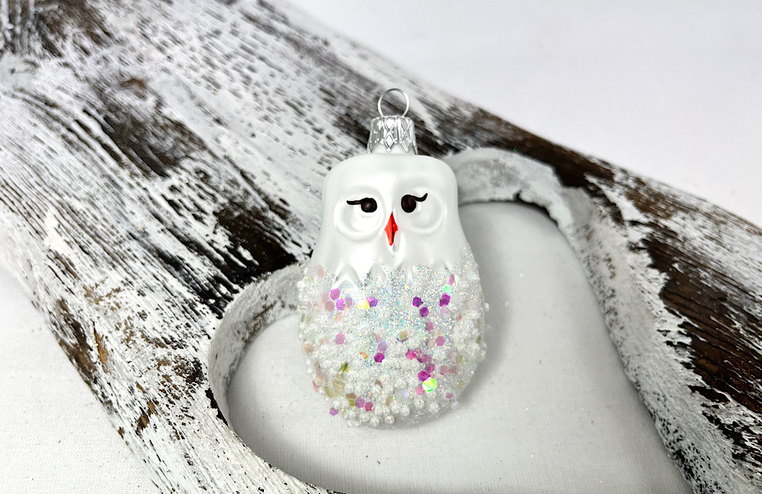Sklenená figúrka v podobe sovičky v bielej matnej farbe s posypom v tvare šesťuholníka , ktorý má ružovú farbu no pri pohybe rôzne odlesky. Dosypané bielymi korálkami.