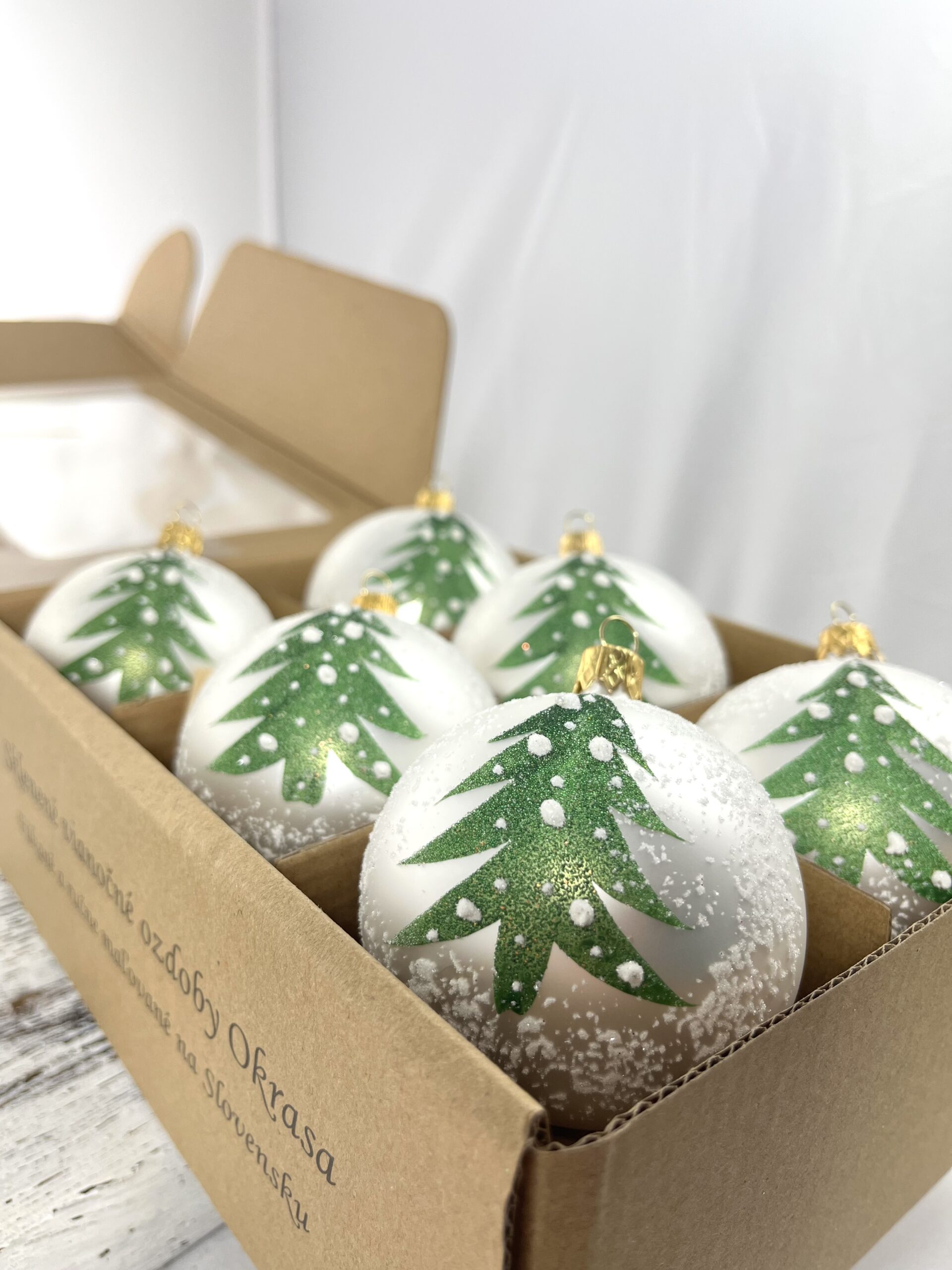 Sklenené biele matné guličky s maľbou zasnežených stromčekov. Všetky guličky sú dohubkové aj zo zadnej strany.