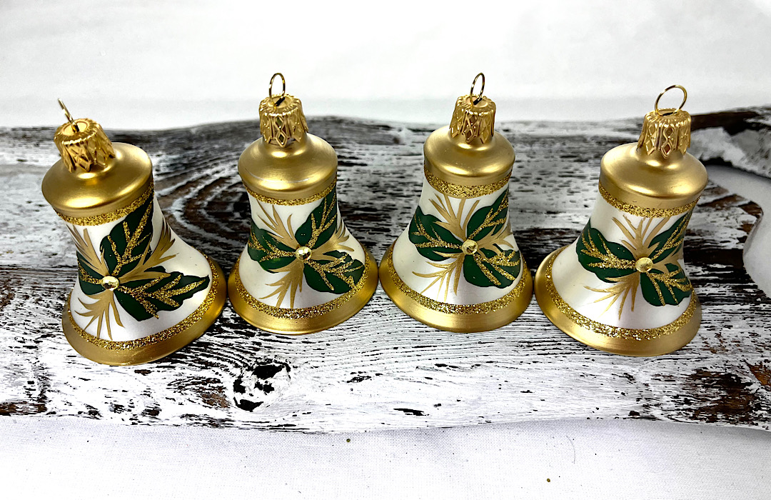 Sklenené luxusné vianočné zvončeky maľované z oboch strán. Zelené listy sú doplnené zlatými vetvičkami. V strede kamienok.