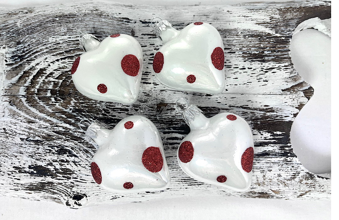 Sklenené vianočné srdiečka v porcelánovej  bielej farbe s červenými  veľkými a malými bodkami.