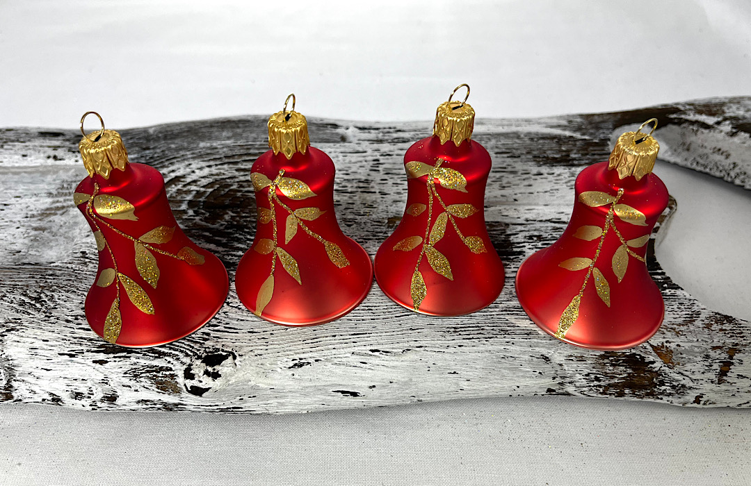 Sklenené zvončeky v červenej matnej farbe so zlatými listami ( zlatý hologram je posyp, ktorý sa pri pohybe trblieta v odleskoch ružovej, zelenej, modrej, fialovej farbe) .