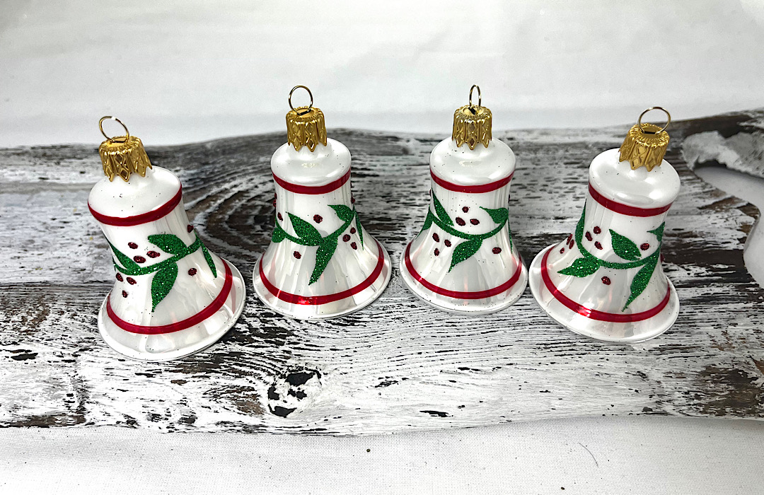 Sklenené zvončeky  v bielej porcelánovej farbe s dekorom zelených listov, červených kruhov a bodiek .